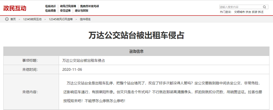 對市公安局回復:于上述所反映的情況,平臺已經專門派警力對所述路段進行了違法停車清理且從重處罰,并將所處出租車違法情況通報該出租車所屬公司,作為"十差駕駛員"報交警支隊。后續平臺將會每天不定時巡查,隨時發現隨時處罰。